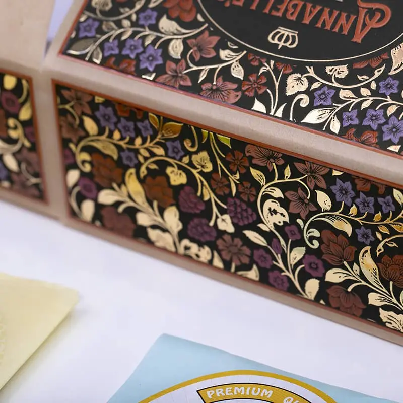 We can realize two kinds of decoration: Digital bronzing and digital local relief glazing. From fine bronzing text to local polishing of high gloss surfaces and large-area patterns with textures, we can meet the needs of personalized packaging industry and apply to medium and large-scale production.